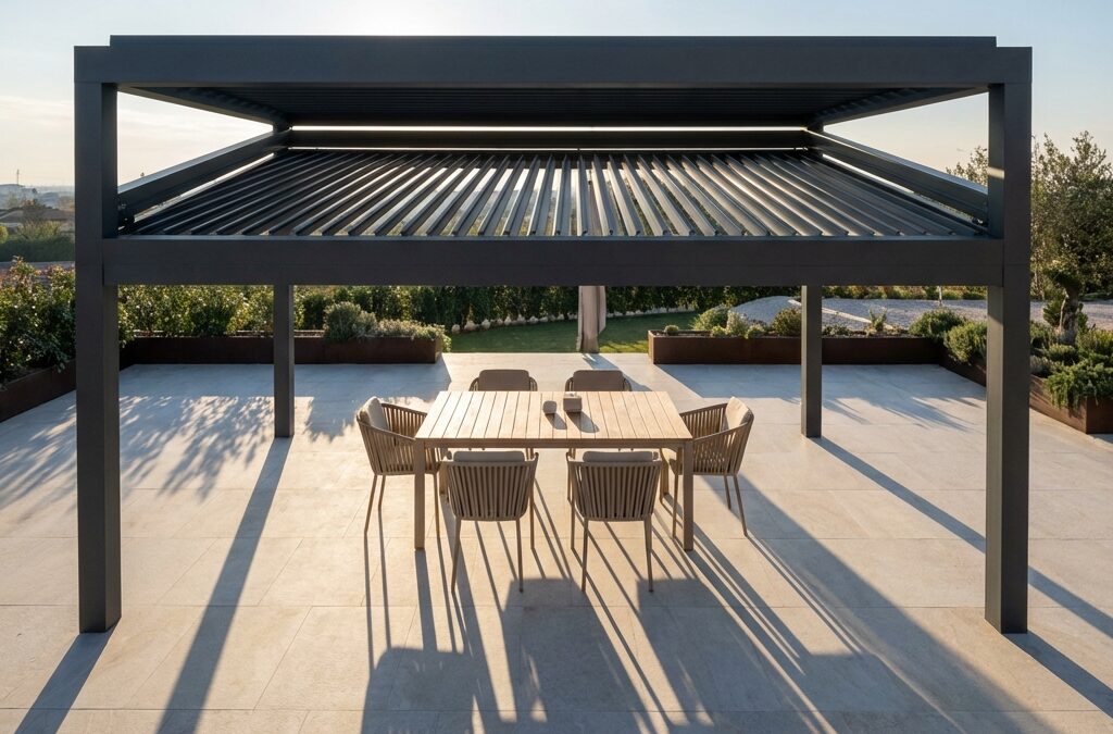 Le pergole bioclimatiche si distinguono per le lamelle orientabili che si aprono e chiudono a comando. Questo meccanismo permette di creare ombra nelle ore piu calde e ventilazione naturale quando serve. Realizzate con materiali made in Italy di qualita premium, garantiscono resistenza agli agenti atmosferici tipici della nostra zona.